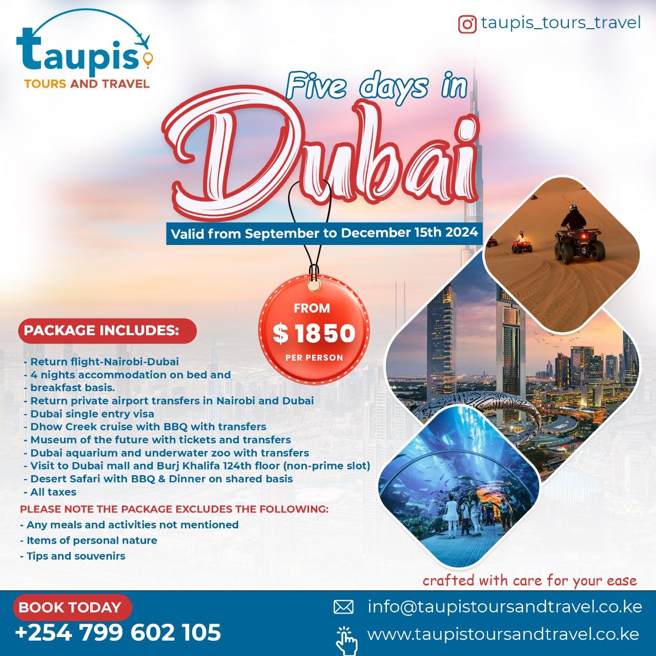 Dubai - 4 Nights Package Valid from September to December 15th, 2024 Cost: Retail: From $1850 per person Package Includes: Return flight (Nairobi-Dubai) 4 nights accommodation (Bed & Breakfast) Return private airport transfers in Nairobi and Dubai Dubai single entry visa Dhow Creek cruise with BBQ (with transfers) Museum of the Future (tickets and transfers) Dubai Aquarium & Underwater Zoo (with transfers) Visit to Dubai Mall & Burj Khalifa 124th floor (non-prime slot) Desert Safari with BBQ & dinner (on shared basis) All taxes included Excludes: Any meals and activities not mentioned Personal items (e.g., souvenirs, tips) Travel and medical insurance Note: Flight fares are subject to change without prior notice. This package offers a comprehensive experience of Dubai, covering major attractions, accommodation, and transfers.